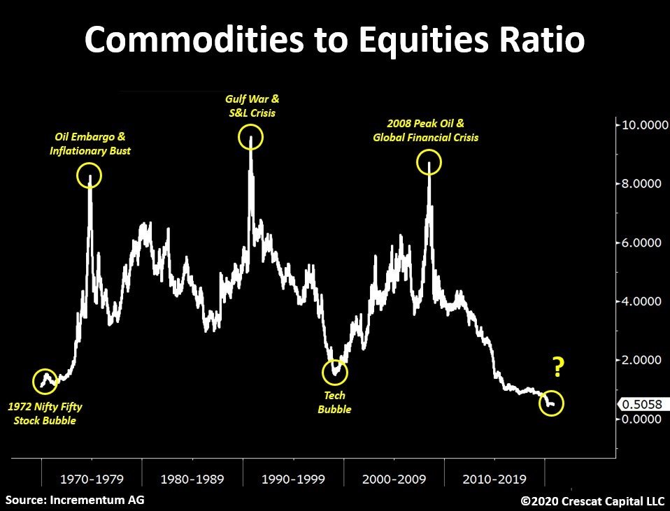Además, la inflación se ha convertido en un tema de discusión bastante habitual recientemente en los mercados financieros. Siempre se ha dicho que un gran beneficiado ante una inflación alta serían los commodities, mientras que las acciones no tienden a hacerlo muy bien en épocas de inflación creciente. Además, el ratio commodities / acciones se encuentra en mínimos históricos como podemos observar abajo.